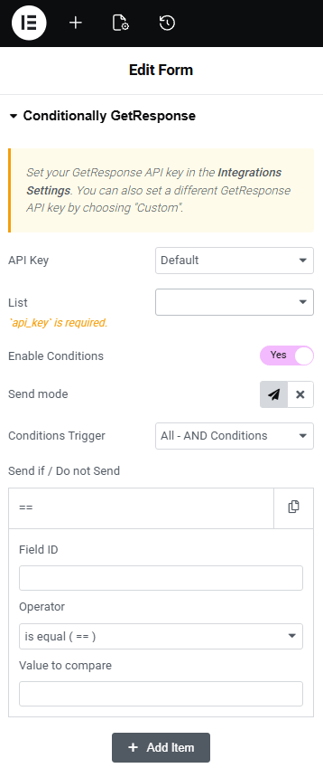 Conditional GetResponse allows you to send form data to your GetResponse list only when specific conditions are met, such as when a user selects an option or checks a box.