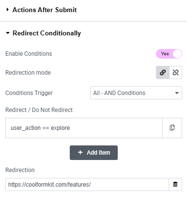 The Cool FormKit plugin makes it super easy to set up smart conditional redirects in your Elementor forms. You can send users to custom thank-you pages or URLs depending on what they select or input, perfect for quizzes, surveys, or multi-path forms.