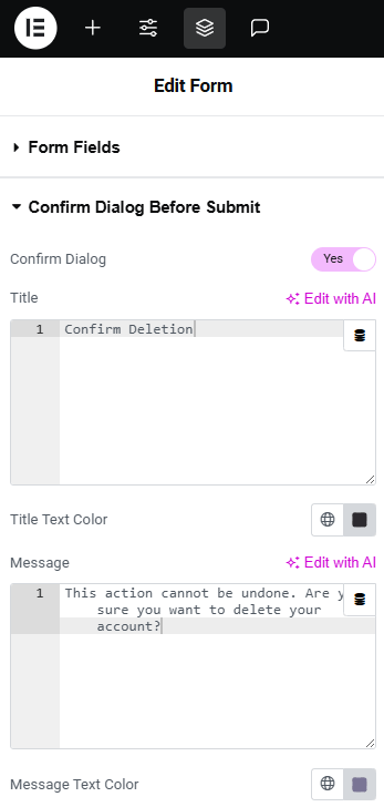 The Confirm Dialog Box feature in Cool FormKit gives you an extra layer of control and safety inside Elementor’s form widget. You can customize the confirmation prompt to match your needs and style. Here’s what you can configure: