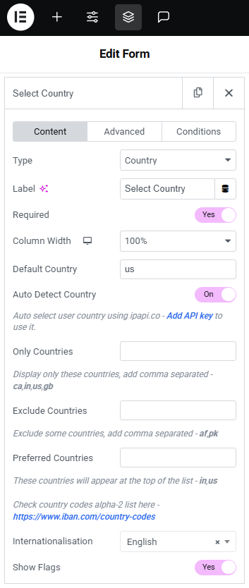 The Country & State fields in Cool FormKit give you full flexibility with simple settings inside Elementor’s form widget. You can customize how countries and states are displayed and behave in just a few clicks. Here’s what you can do: