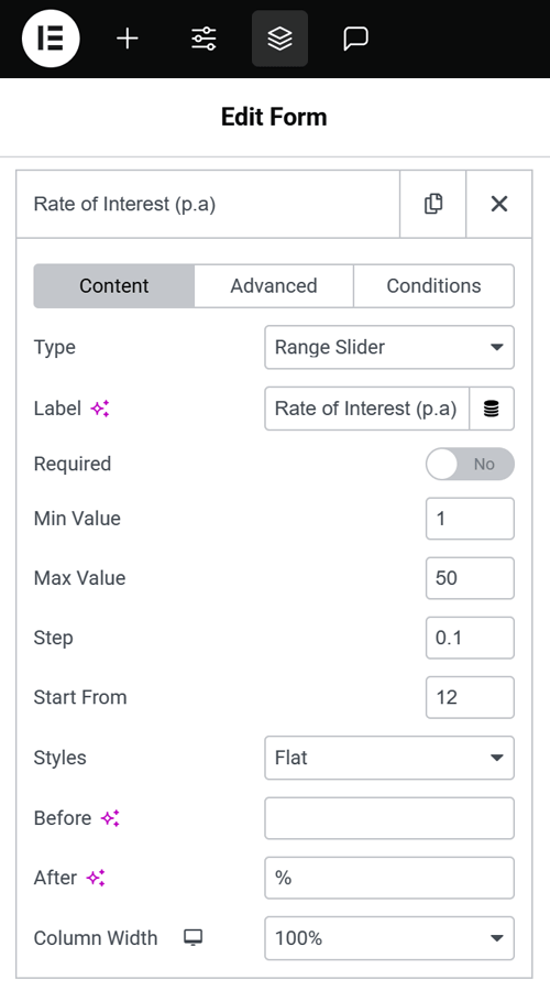The Range Slider field in Cool FormKit gives you full control with easy-to-use settings inside Elementor’s form widget. You can adjust its behavior, design, and style in just a few clicks.