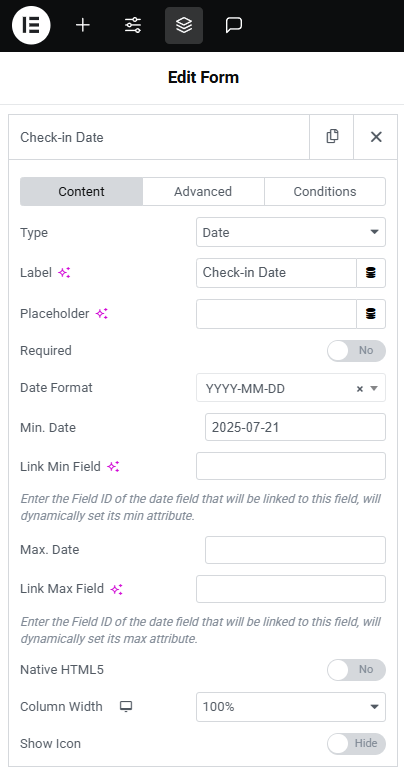 You can easily define allowed date ranges, link fields dynamically, and guide users with helpful UI hints — all within the Elementor form widget.