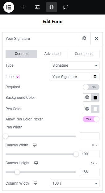 The Signature Field in Cool FormKit gives you complete flexibility with easy-to-use settings inside Elementor’s form widget. You can customize its behavior, look, and feel effortlessly.